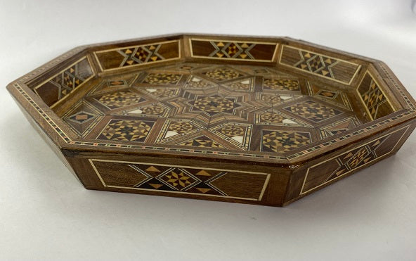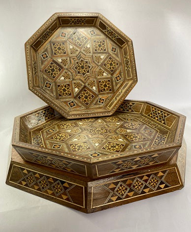 Bandejas de madera, hechas a mano y con incrustaciones de mosaico y nácar.